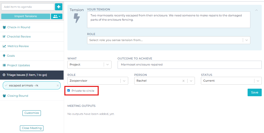When a project is created in a meeting, you can make it visible only to members of the circle that holds that project. To do this, check the box next to "Private to circle" while adding a project in the meeting interface: