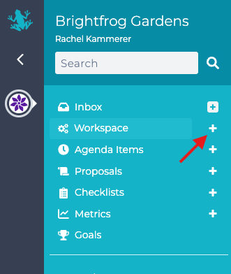 From any page in GlassFrog, you can add a project from the left-hand sidebar by clicking on the plus sign next to 'Workspace'.