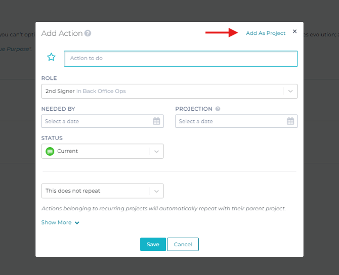 This will pull up a menu to add an action. To add a project instead, click "Add As Project" in the upper right-hand corner.