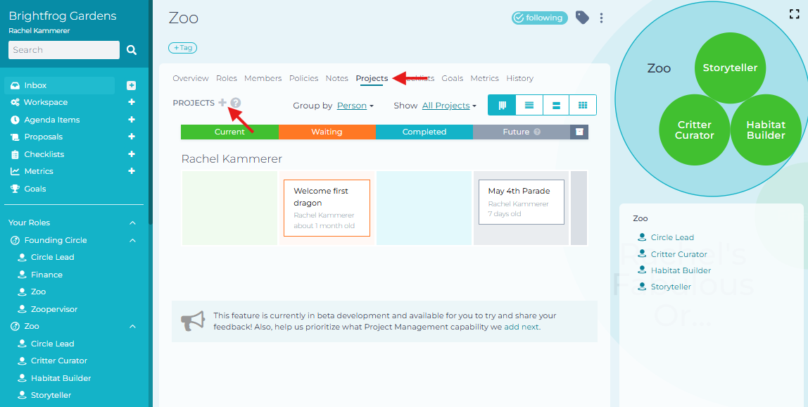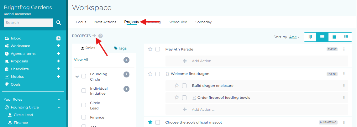 While on the page of any of your roles or circles, click on the 'Projects' tab, and then click the plus sign icon next to the 'PROJECTS' heading.