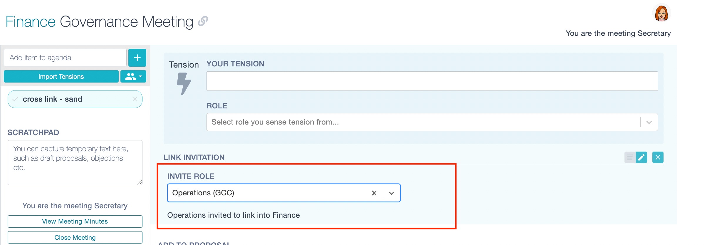 While Setup Mode is on or with Holacracy Governance turned off, a Circle Lead or Secretary of a circle wishing to add a Linked Role, a GlassFrog Admin, or the sole member of a circle wishing to add a Linked Role may use the following method to invite a Linked Role into any circle.