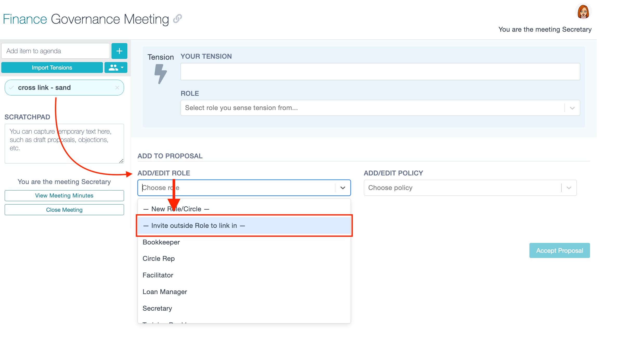 Linked Roles can be created through the Governance Meeting interface or proposed using an asynchronous proposal (see How do I create an asynchronous governance proposal? (Premium)). In a proposal or Governance agenda item, click the dropdown field under "Add/Edit Role," and select "Invite outside Role to link in" near the top.