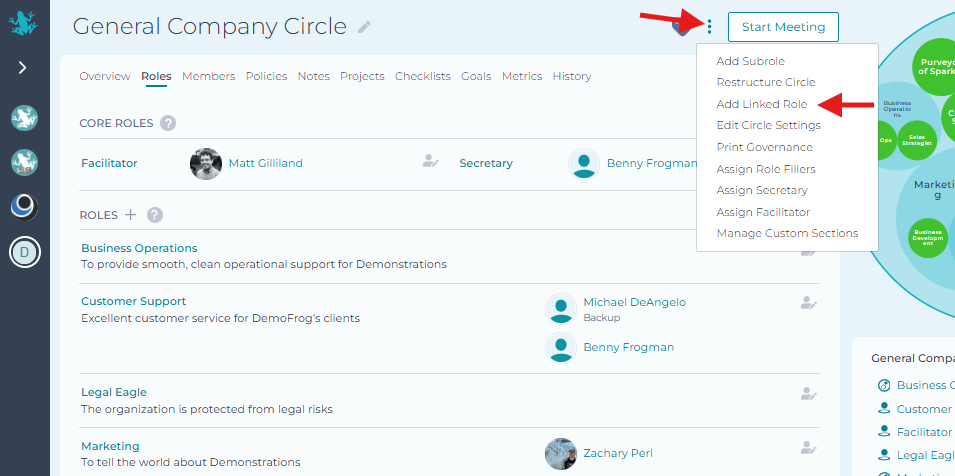 In other cases, they would like to have the same role with the same role-fillers representing that role in both circles. GlassFrog's Linked Roles feature allows organizations to embed a role from one team/circle within the organization into one or more other teams/circles, without the original circle giving up control over that role's definition.